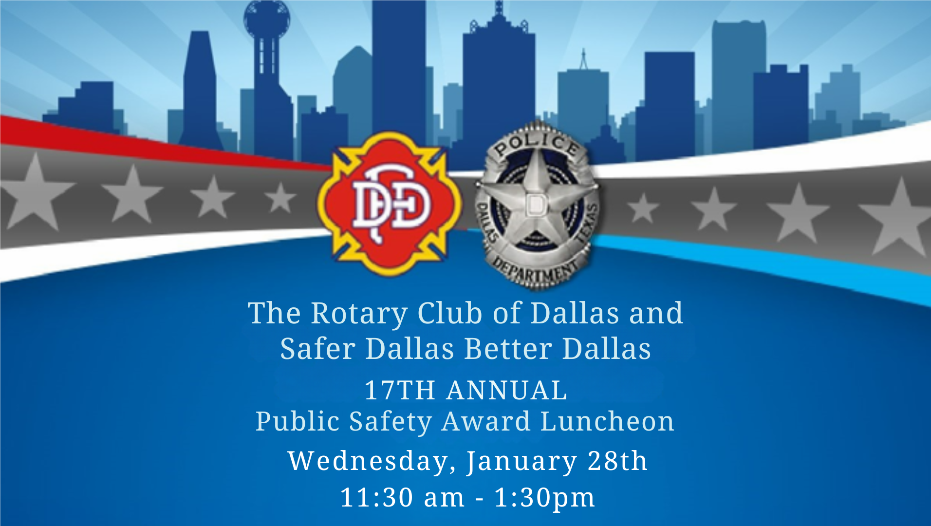 Join us for the 17th Annual Awards Luncheon honoring the dedicated men and women of the Dallas Police Department (DPD) and the Dallas Fire-Rescue (DFR), as well as a distinguished Public Safety Leader in our community.